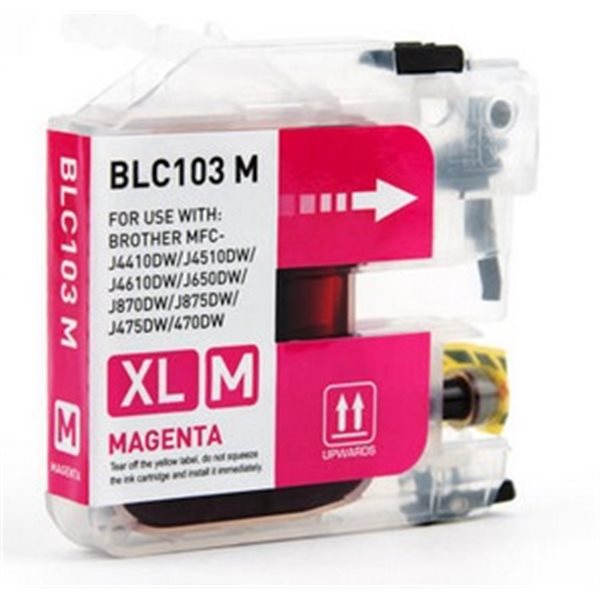 Notre cartouche compatible LC103M Magenta est moins cher qu'une cartouche vendue à la marque du fabricant. Notre Cartouche Jet d'Encre vous offre des rabais importants par rapport aux cartouches vendues au label de la marque. Notre Cartouche Jet d'Encre offre une capacité importante de Haute capacité * et est compatible avec les familles d'imprimantes DCP J152 , DCP J152W , MFC J285DW , MFC J470DW , MFC J650DW , MFC J875DW , MFC J870DW , MFC J4310DW , MFC J4410DW , MFC J4510DW , MFC J4610DW , MFC J4710DW , MFC J6520DW , MFC J6720DW , MFC J6920DW . Par l'achat d'une Cartouche Jet d'Encre LC103M BesTonerShop garantie A vie vous avez l'assurance d'une qualité optimale au moindre coût.* Rendement estimé - sans garantie- avec un taux de remplissage de 5%
